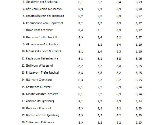 Auf dem 21. Platz im Ranking ist unser Skuggablakkur vom Lipperthof zu Hause. Der junge Hengst erzielte eine Gesamtnote von 8,22 und ist ein Nachkomme von Skvisa vom Lipperthof und Lykill frá Blesastöðum.