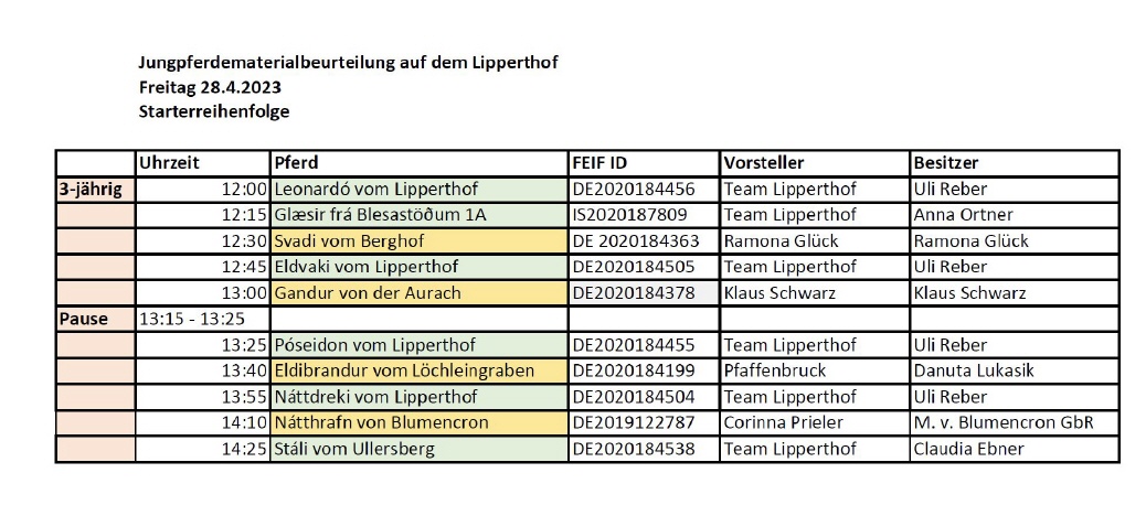 Jungpferdebeurteilung 2023 Wir freuen uns sehr auf die bevorstehende Jungpferdematerialbeurteilung und Körung 2023 am 28.4.2023Anbei findet ihr den vorläufigen Zeitplan, Stand 25.04.2023
