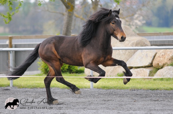 Eldfari befindet sich momentan in den Vorbereitungen auf seine erste gerittene Zuchtprüfung. Er zeigt bisher enorme Tempofähigkeit und sehr viel fließenden, natürlichen Tölt mit toller Bewegung.